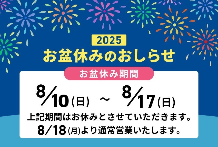お盆休みの間(8/10~8/17)、休業させて頂きますので何卒よろしくお願いいたします。