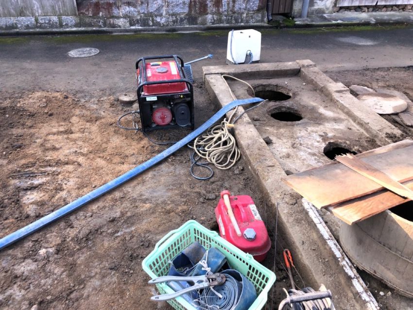 長らく放置された便槽には、雨水など溜まっているため水抜き作業を行います。