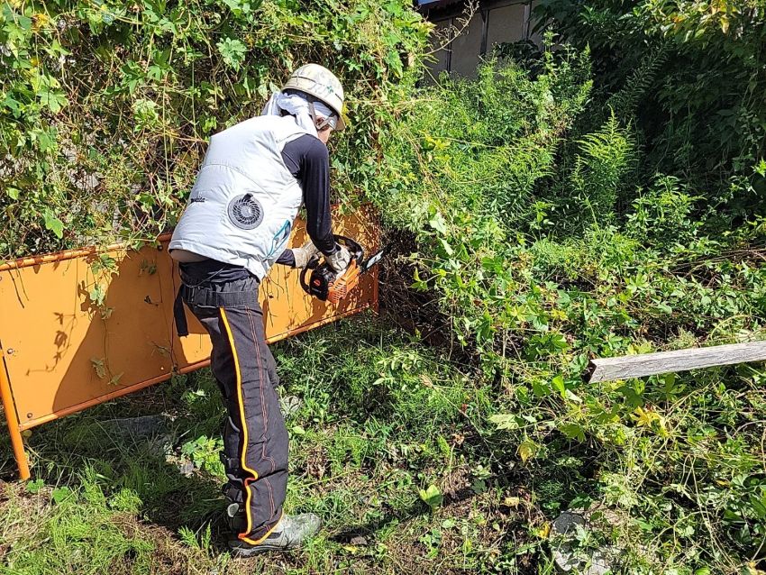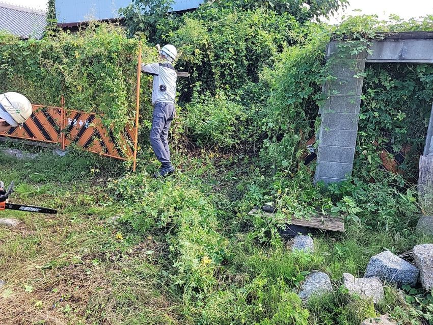 作業員が手分けをして、雑草や庭木を撤去し、ダンプや重機の進入路を確保します。