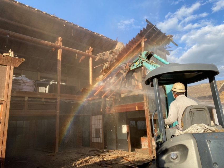 粉じんが飛散しないよう、散水をしっかり行いながら解体を進めていきます。