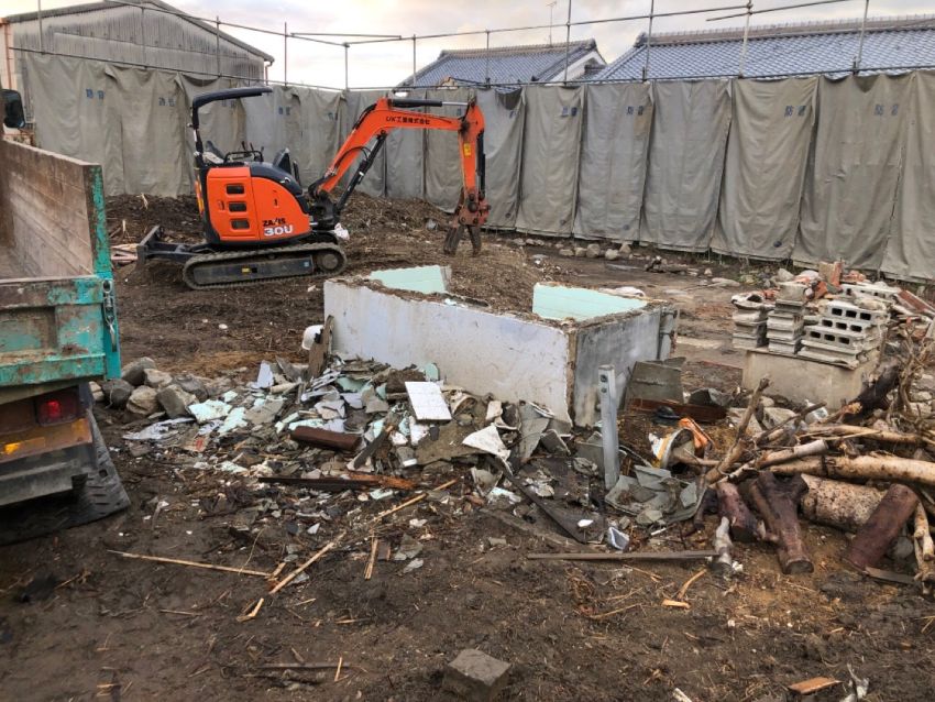 住宅部分の建物を撤去した後は、建物の基礎部分を撤去していきます。