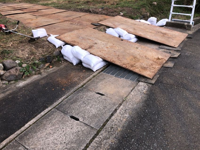 道路の側溝を傷めないよう、土嚢で補強して鉄板を敷きます。