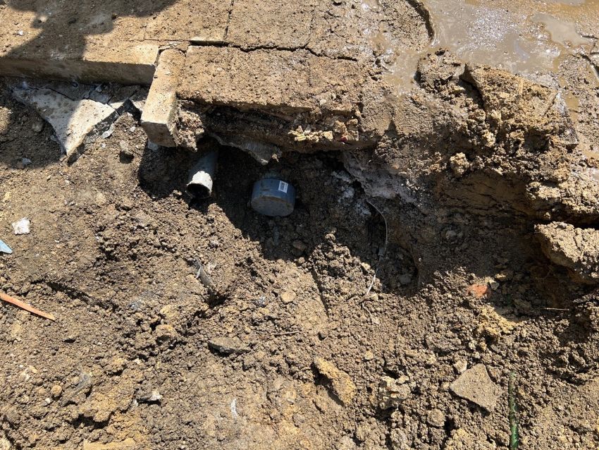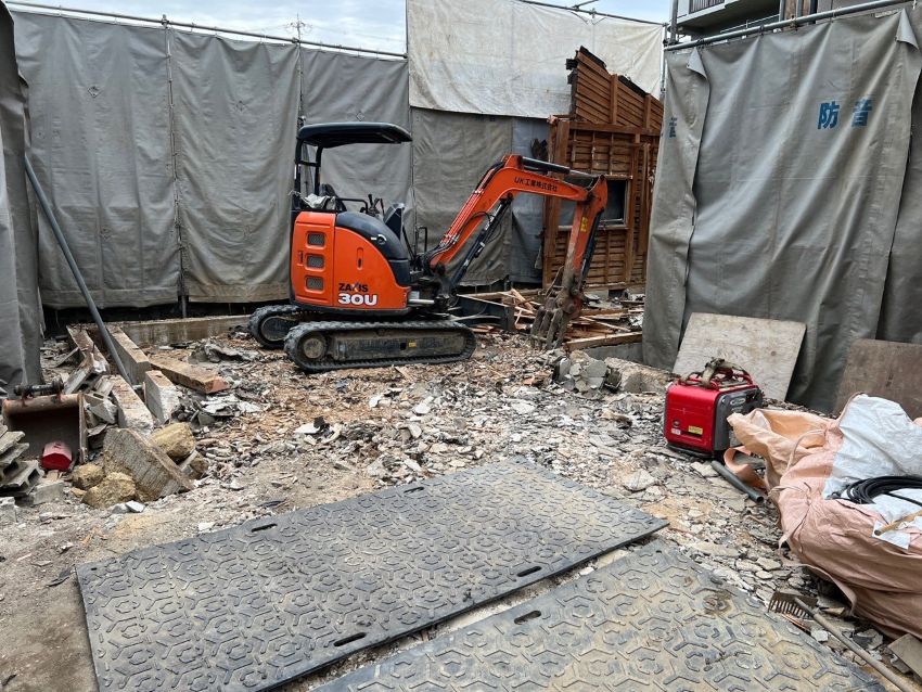基礎の撤去後は、埋設物の確認をし、汚水パイプなどの終いを行います。