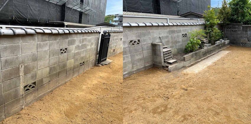 花壇は手作業で解体し、土とブロックを分別しながら撤去した後は、重機やダンプの進入路を確保します。