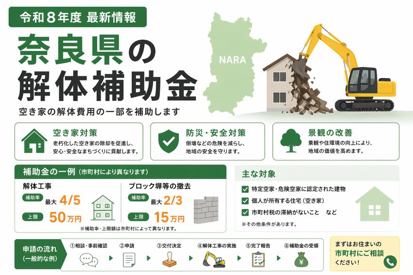 奈良県では、老朽化した空き家の増加を背景に、**解体工事に対する補助金制度(令和8年度)**が各市町村で実施されています。